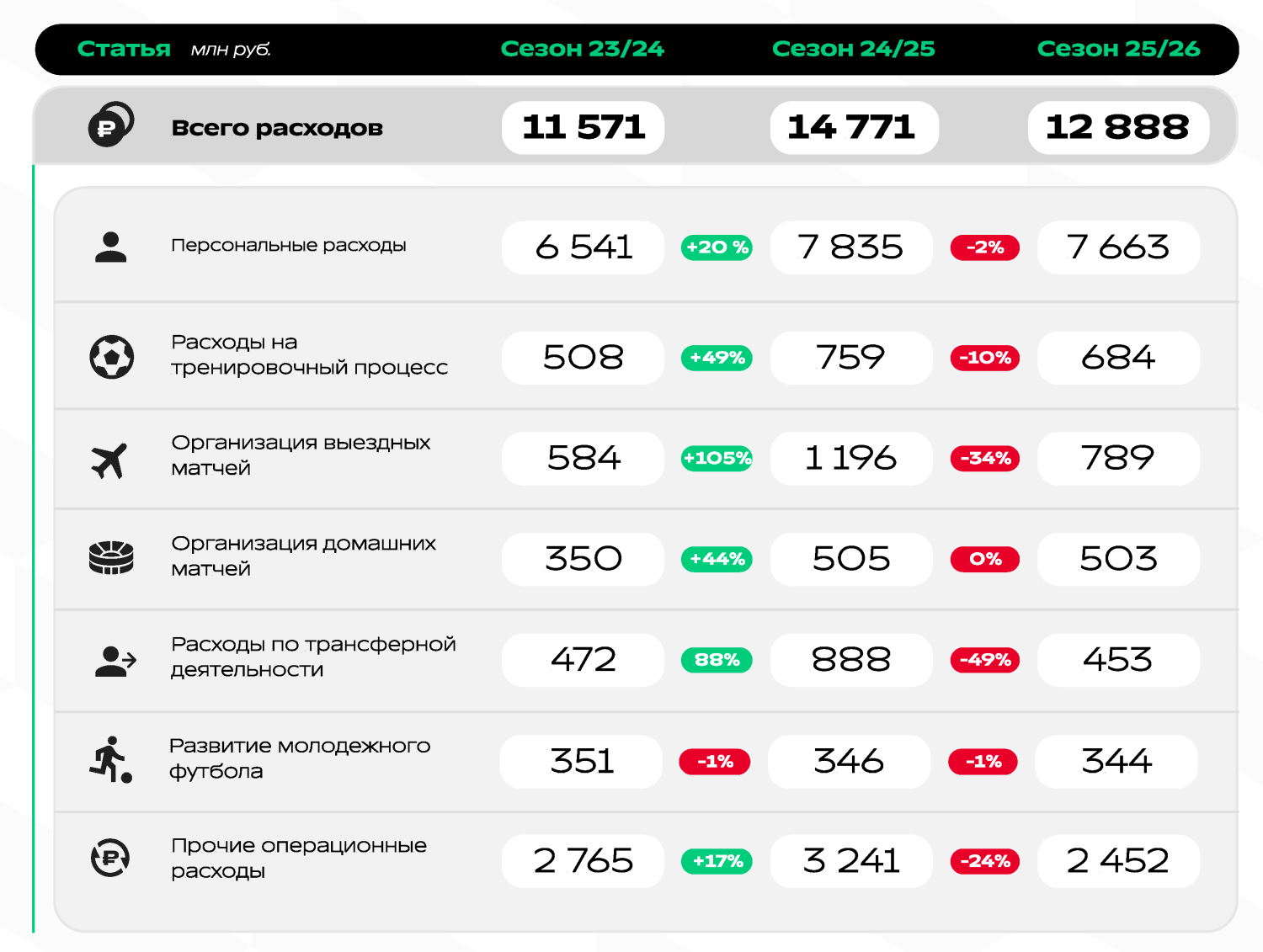 «Волатильность бюджетов от сезона к сезону объясняется ротацией команд внутри вертикали российского футбола. Плановый бюджет на сезон-25/26 стабилизируется после пикового роста, при этом ожидается превышение фактических данных над плановыми по итогам сезона», – полагают авторы отчета.