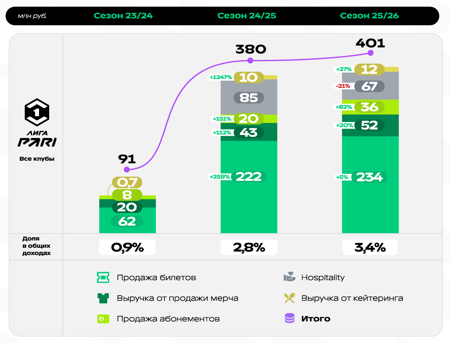 В сезоне-2025/26 матчдей должен принести клубам первого дивизиона должны ₽401 млн, что составит 3,4% от общих доходов. В прошедшем сезоне эта доля равнялась 2,8%, годом ранее – 0,9%. Авторы отчета отмечают, что все более заметную роль в структуре этой статьи стала играть выручка от абонементов (₽20 млн в сезоне-2024/25) и VIP/hospitality-сервисов (₽85 млн). Утверждается, что «Первая лига успешно отошла от монозависимости от продажи билетов» и перешла «к более сложной и устойчивой бизнес-модели, характерной для зрелых спортивных лиг». Смелое заявление, учитывая скромную долю матчдея в общих доходах, а также тот факт, что эти доходы (₽380 млн) уступают расходам на организацию матчей (₽505 млн).