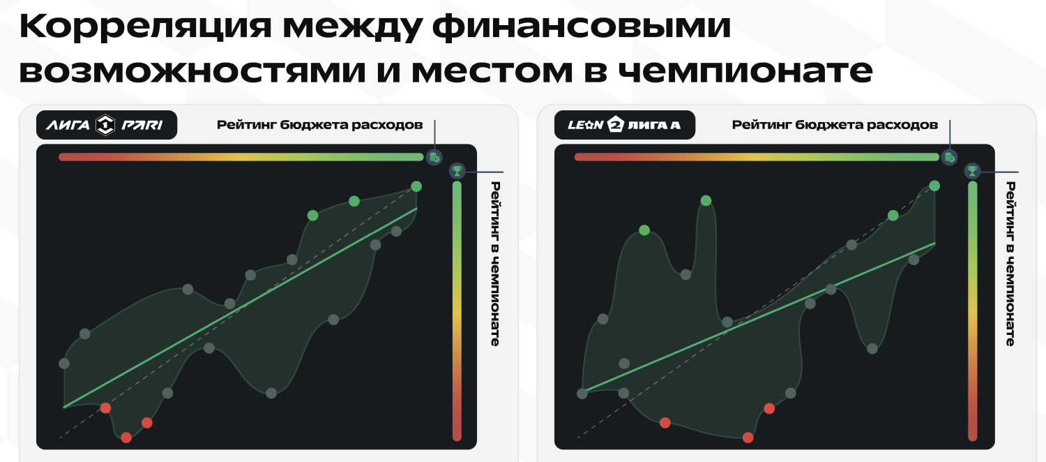 При сравнении средних показателей трех лиг выясняется, что расходы в Лиге Пари примерно в три раза выше, чем во Второй лиге А, которая, в свою очередь, также в три раза затратнее Второй лиги Б. При этом бюджеты клубов, претендующих на повышение в классе, фактически равны бюджетам команд, борющихся за сохранение места в более высокой лиге. При этом в Лиге Пари преимущество в финансировании, как правило, приводит и к более высокому результату. А вот во Второй лиге А эта зависимость менее четкая.