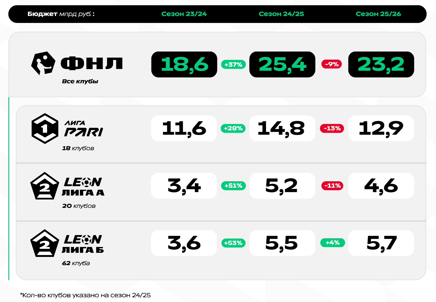 В сезоне-2024/25 суммарный бюджет 97 клубов, выступающих в турнирах ФНЛ, составил ₽25,4 млрд: ₽14,8 млрд в Лиге Пари (18 клубов), ₽5,2 млрд – в Второй лиге А (20), ₽5,5 – во Второй лиге Б (59). Это на 37% больше, чем годом ранее. Но в сезоне-2025/26 ожидается небольшое снижение – до ₽23,2 млрд (по лигам: ₽12,9 млрд + ₽4,6 млрд + ₽5,7 млрд).