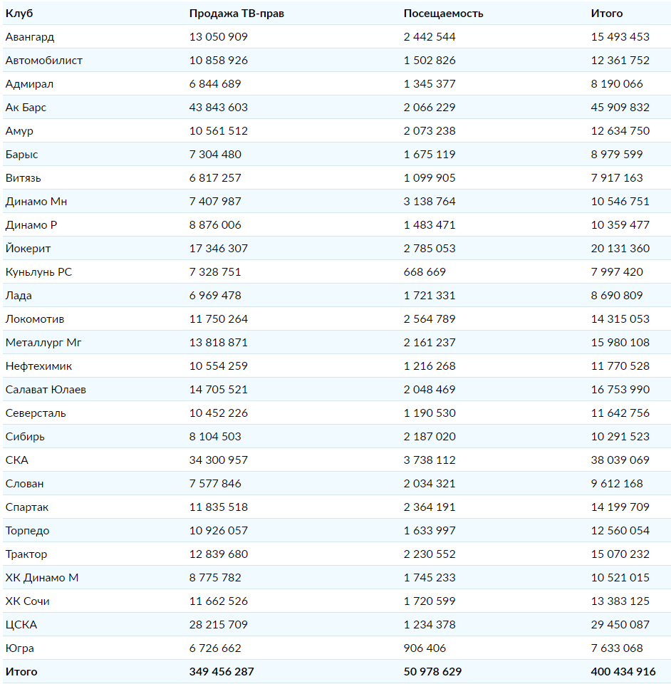 В итоге общая сумма составит чуть более ₽400 млн. Больше всего получит чемпион прошлого сезона казанский «Ак Барс» – ₽45,9 млн. Меньше всего достанется «Югре» (Ханты-Мансийск), которая по итогам сезона покинула КХЛ, – ₽7,6 млн. Для сравнения, потолок зарплат игроков одной команды в прошлом сезоне составлял ₽900 млн.