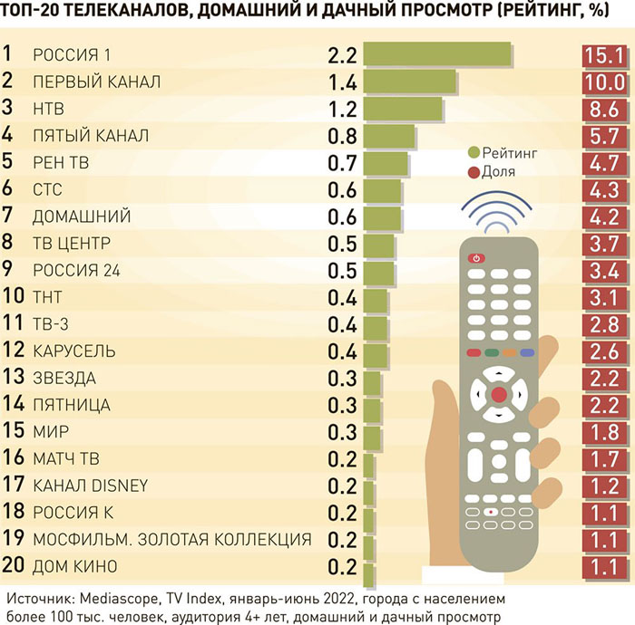 Если смотреть рейтинги телеканалов за первое полугодие, «Матч ТВ» оказался 16-м по популярности, говорится в исследовании Mediascope, проведенном по всей России среди аудитории 4+. Самыми популярными каналами остаются «Россия» и «Первый», которые вместе опережают и по рейтингу, и по доле все другие каналы из первой пятерки.